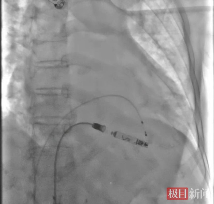 手术中,麻醉医生郭一新、毕光焰为老人实施全麻,心内手术团队通过右侧腹股沟处一厘米粗的穿刺点,将“胶囊”大小的无导线起搏器植入患者心肌处。手术历时40分钟,术后老人生命体征平稳、心脏重归正常跳动。